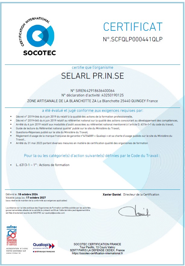 Organisme de formation en sécurité incendie, le cabinet PrInSe est certifié "QUALIOPI". Toutes nos formations en sécurité incendie sont donc prises en charge par votre OPCO et votre compte CPF.